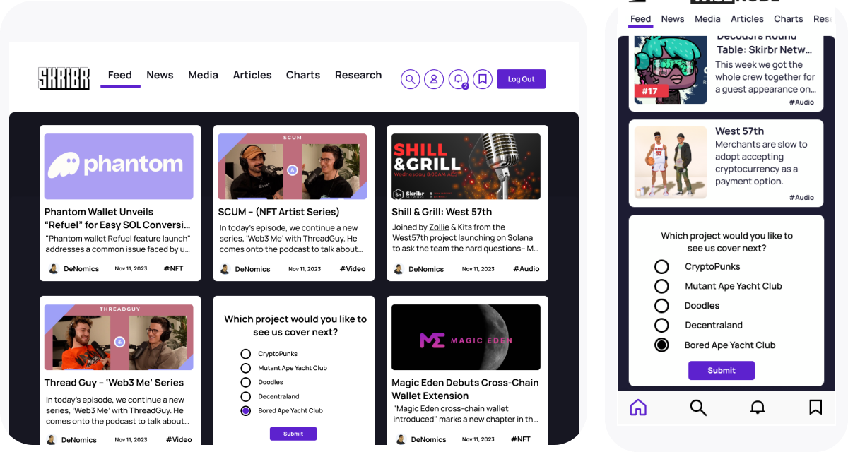 Skribr’s main content is highlighting articles that help educate users on what is happening in the world of crypto and DeFi and how it effects them. This also includes highlighting to nft projects.